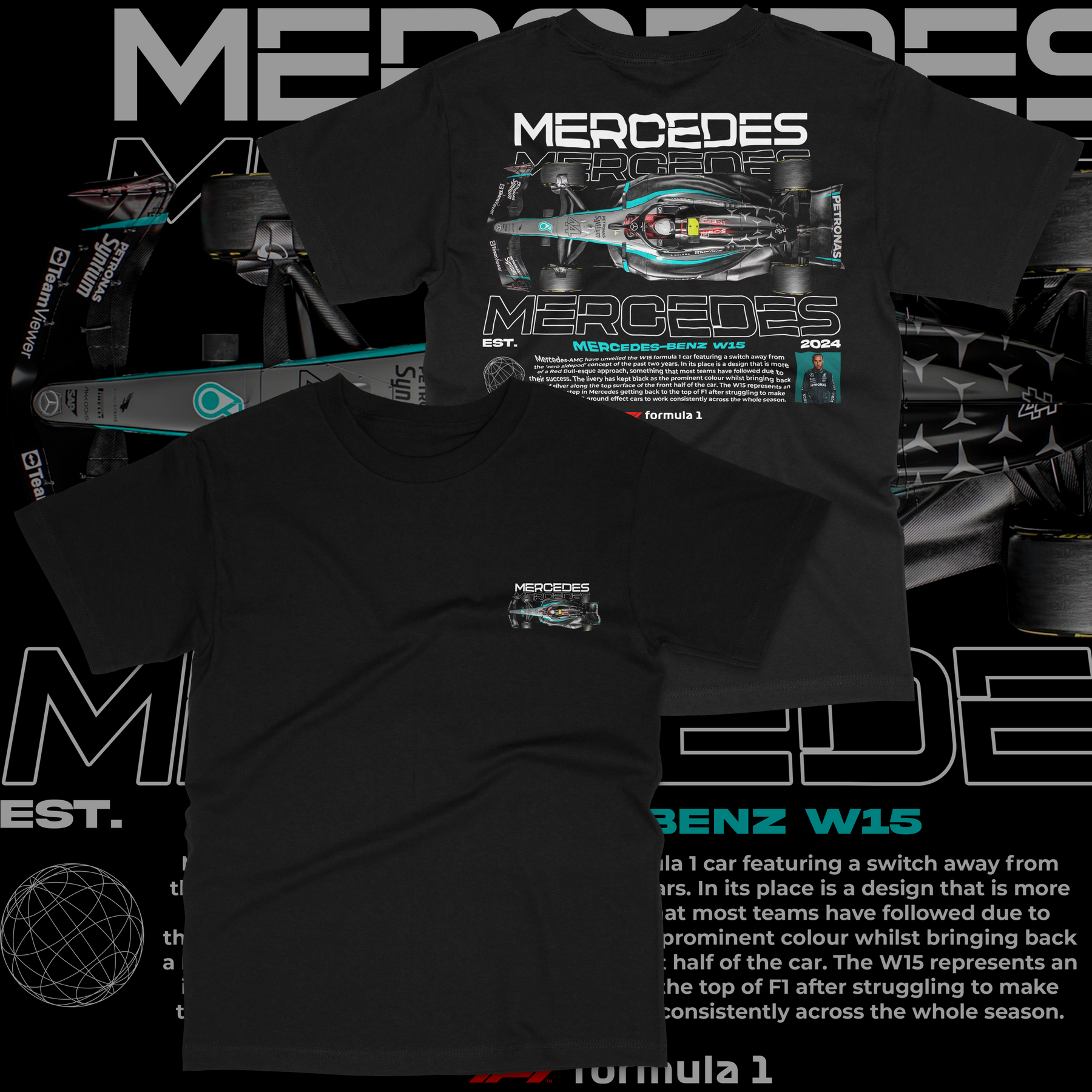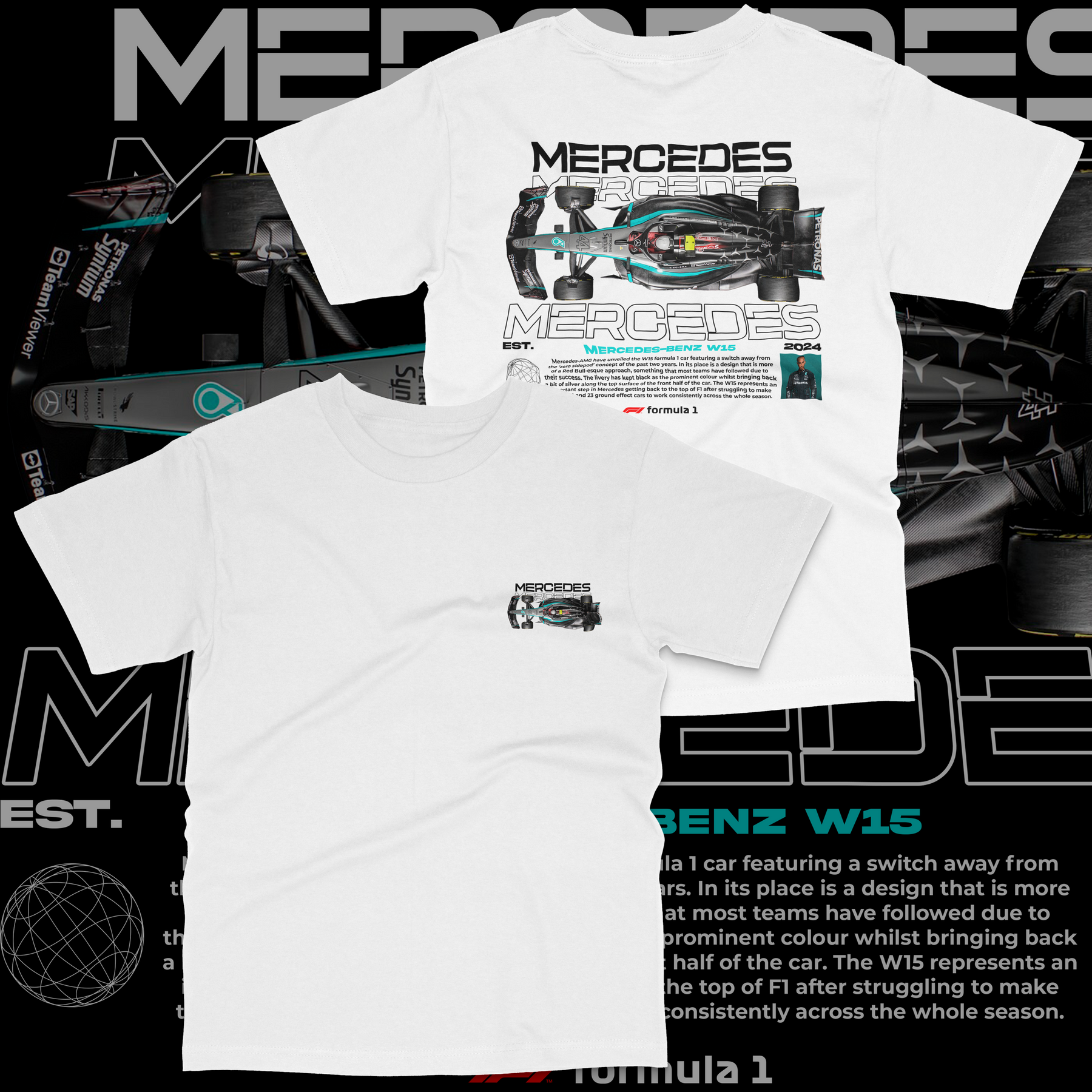 • Clean Mercedes logo + car front graphic / full detailed W15 artwork on the back